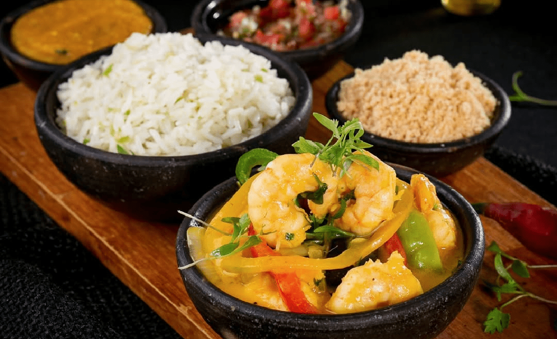 No Vini Figueira Gastronomia, a proposta passa pela culinária baiana, com pratos como moqueca de peixe, bobó de camarão e arroz de frutos do mar, disponíveis tanto no salão quanto para entrega.