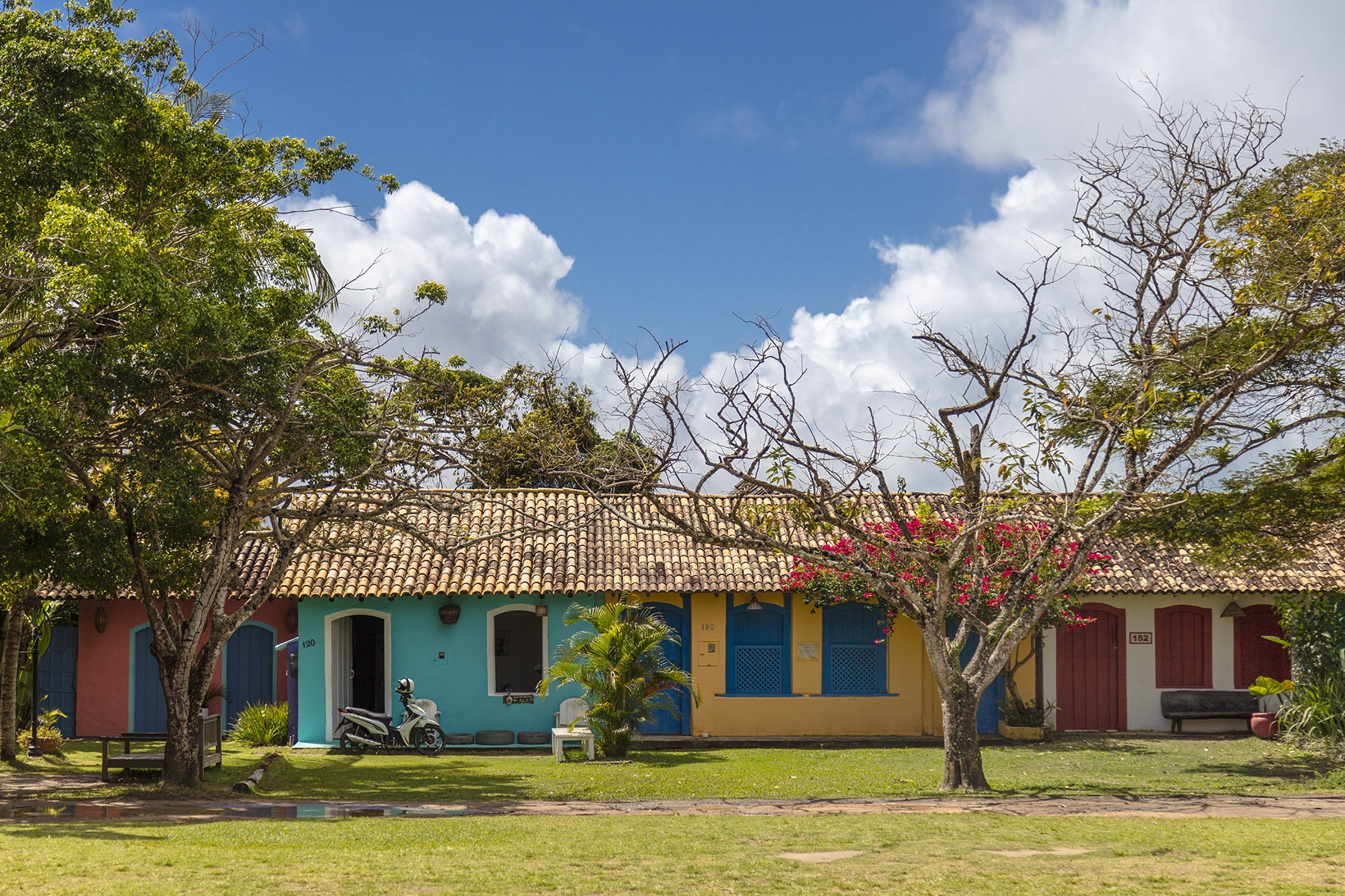 As casas do Quadrado são térreas, volumetria baixa construídas diretamente no chão de terra batida. Não existe disputa por altura e nem grito arquitetônico. Só a presença delas mesmo e as cores! Amo as cores desse lugar. Amarelos queimados, verdes fechados, azuis densos, outras cores vibrantes, rosas que parecem absorver o “golden hour”. Em Trancoso, a cor não é tendência, é identidade. Não está ali para agradar turista. Está ali porque sempre esteve e é justamente isso que me encanta nesse pedacinho de Brasil. Me questiono, será que existe alguém que normatiza as cores do Quadrado e fiscaliza quando está na hora de repintar?! Será que alguém pode trocar a cor da fachada porque simplesmente “enjoou” da cor que estava?! Toda vez que volto pra lá, parece que nada mudou, nem o tempo foi capaz de danificar todo o charme desse lugar.