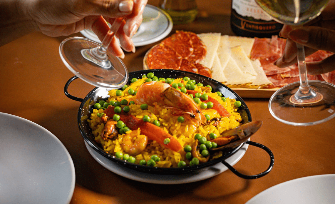 Para os pratos principais, o restaurante oferece clássicos como a Paella Marinera, a Paella Negra, as Gambas de La Reina, além de receitas tradicionais com bacalhau, como o Bacalhau Gomes de Sá e o Bacalhau à Sevillana, preparados para servir grupos de quatro ou oito pessoas.